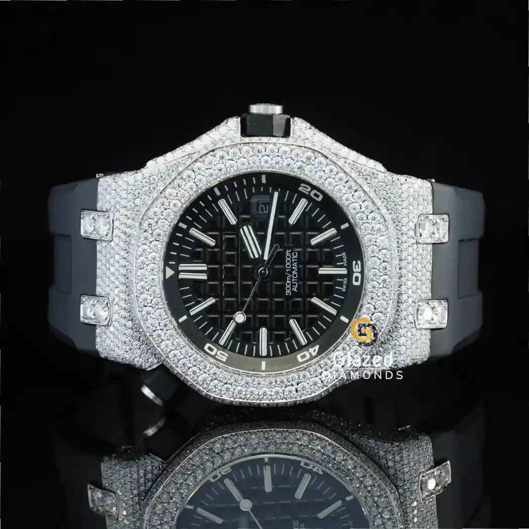 Face Diaal Iced Out Moissanite Watch For Men In Black Silicon Belt