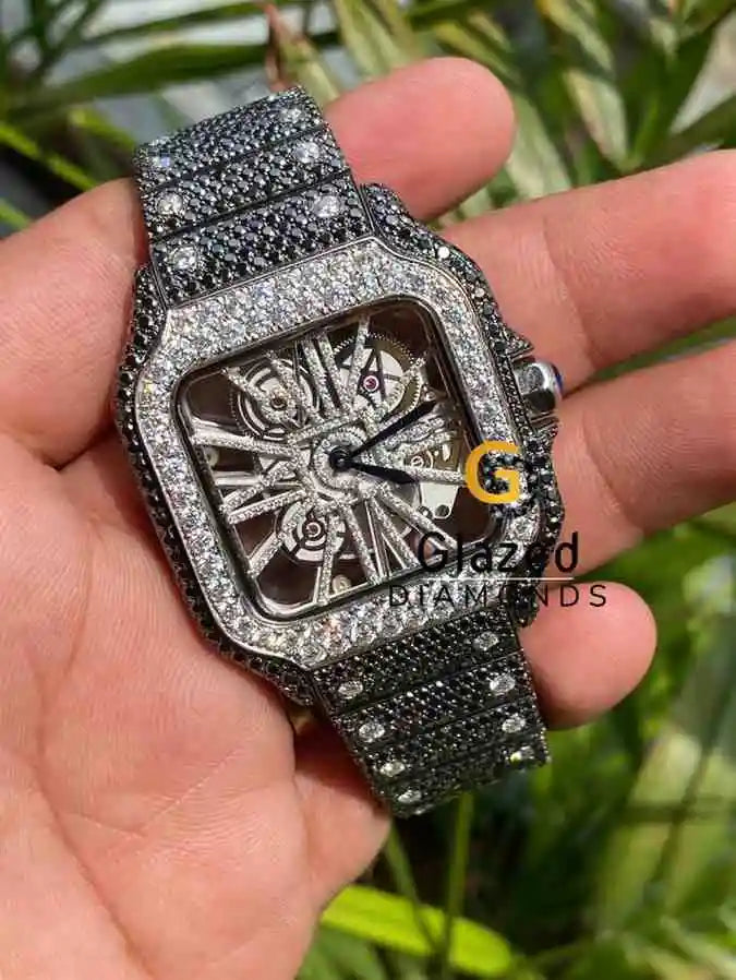 Stunning Fully Iced Out Skeleton Style Black Diamond Moissanite Watch