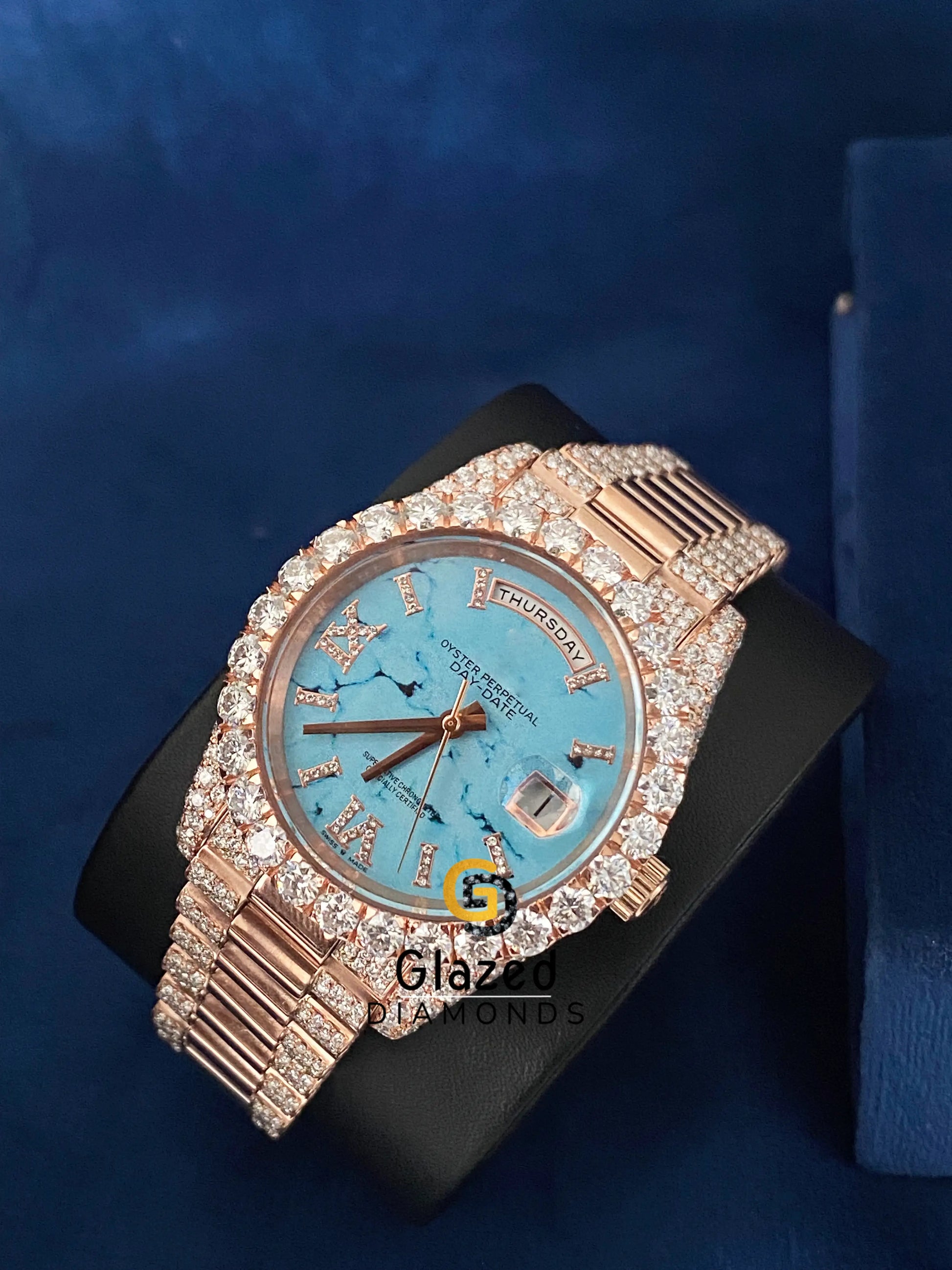 Presenting the Turquoise Marble Dial Presidential Strap Day Date Moissanite Watch with Watch Box, Bag & Guidance.